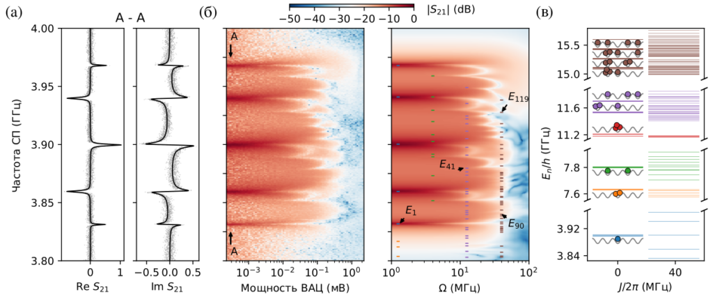 Рис. 2. (а) Данные пропускания, содержащие полную информацию об амплитуде и фазе прошедшего сигнала. (б) Сравнение экспериментальных данных (слева) и расчета (справа) при увеличении мощности накачки. (в) Структура энергетических уровней в системе и их физический смысл