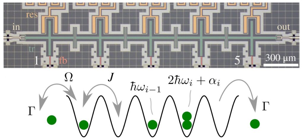 В новом исследовании, проведенном российскими учеными, впервые показано, что линейные массивы трансмонов могут использоваться для изучения спектров модели Бозе — Хаббарда в сравнительно простой архитектуре: путем подключения их к микроволновым волноводам и проведения прямой спектроскопии пропускания. В такой схеме симулятор воспроизводит динамику нелинейного квантового кристалла в неравновесном диссипативном режиме, который до этого изучался лишь теоретически.
