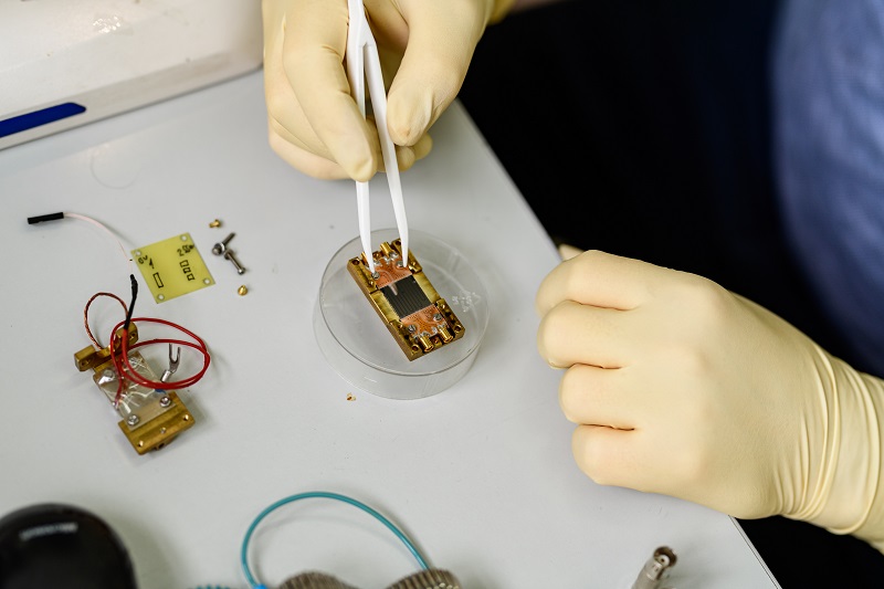 Монтирование сверхпроводящего чипа на плату. Фотограф — Андрей Змеев, пресс-служба МФТИ
