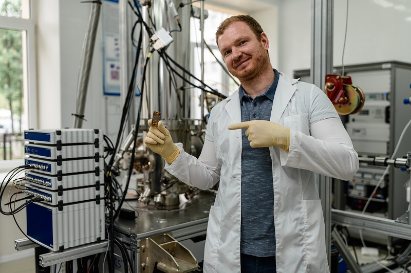 Игорь Головчанский с с исследуемым чипом в руках. Фотограф — Андрей Змеев, пресс-служба МФТИ