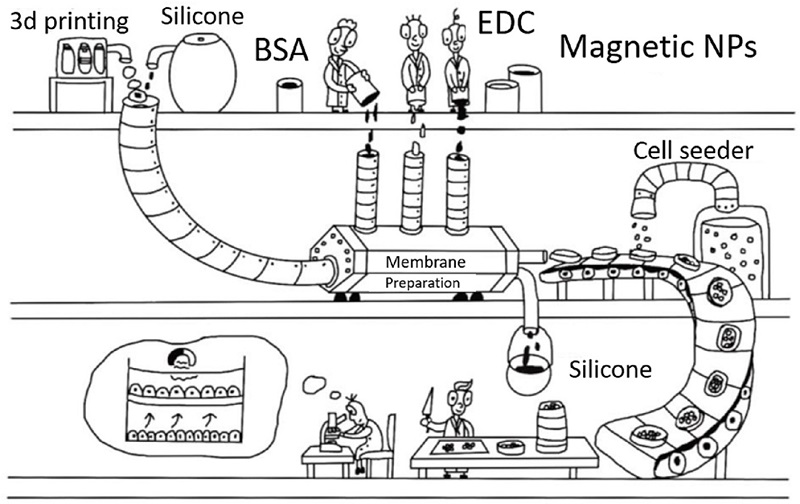 Илья Зубарев, руководитель исследования, старший научный сотрудник лаборатории регуляции клеточной сигнализации МФТИ, рассказывает: «Мы решили создать матрицу на основе сшитого белка. Такие системы часто используются для моделирования биологических матриц. Чтобы добиться возможности совместного культивирования различных клеток, мы выбрали оригинальный раствор, который ранее не применялся. Чтобы внутри сосуда сохранялась нужная высота белковой мембраны, мы решили насытить ее магнитными наночастицами. В качестве основного компонента мембраны был выбран бычий сывороточный альбумин (БСА). Этот белок нетоксичен, широко доступен, активно используется в различных областях биологии и, как правило, уже есть в любой лаборатории».