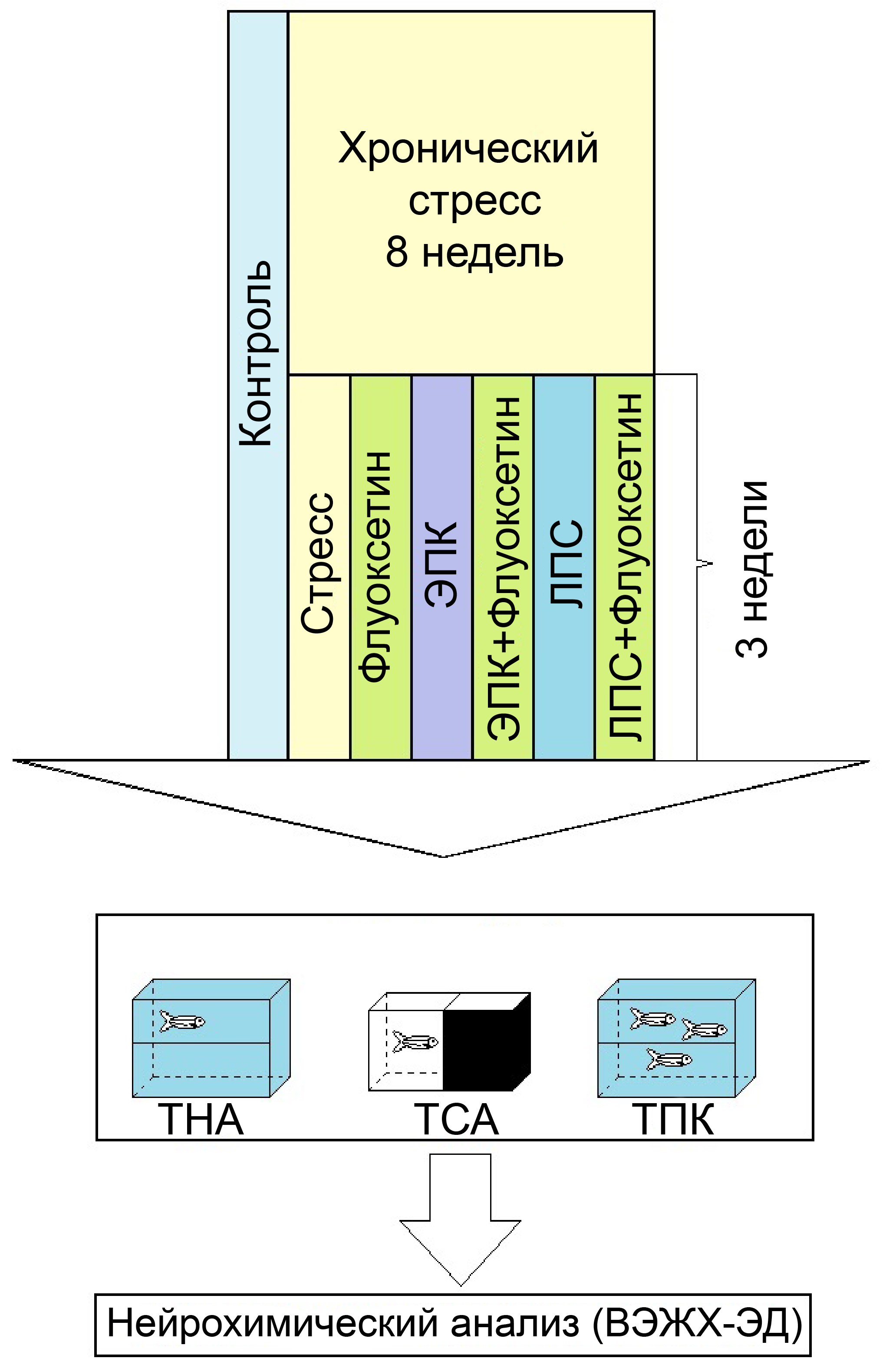 Исследователи проанализировали влияние стресса на поведение и гормональный фон зебраданио. Перед началом эксперимента популяцию из нескольких десятков особей содержали в стандартных, комфортных для них условиях: большом аквариуме с оптимальной температурой воды и освещением. Затем половину рыб переносили в другие аквариумы, в которых все было не столь благоприятно: температура воды оказывалась выше или ниже привычной, плавал хищник или вода содержала его «запах», свет был слишком ярок или отсутствовал вовсе, не было пищи или действовали другие стрессовые условия. Разнообразные испытания проходили ежедневно в течение одиннадцати недель, при этом биологи контролировали текущее состояние рыб, а после окончания этого срока проводили фармакотерапию стресса. В качестве антидепрессанта ученые использовали широко применяемый в медицине препарат флуоксетин. Новизна подхода заключается в том, что исследователи параллельно вместе с ним давали рыбам еще и иммуномодуляторы: липополисахарид — провоспалительный полимер из клеточной стенки бактерий, который вызывает иммунную реакцию, — и эйкозапентаеновую кислоту, которая входит в состав многих животных жиров и подавляет воспалительные реакции в организме.