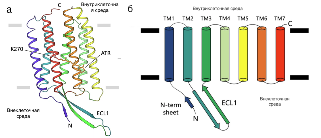 а) структура исследованного родопсина, б) схема соединения спиралей белка