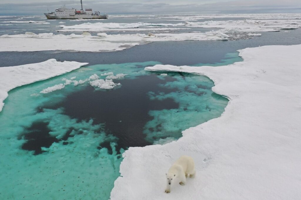 «За ту неделю, что у нас не было связи, экспедиция “Плавучего университета” смогла сквозь льды достичь самой северной точки своего путешествия: 83° северной широты. В этом месте глубина Северного Ледовитого океана достигает ~2850 м. По мере продвижения на север судно попало в ледовый массив в районе острова Визе. “Академик Иоффе” может без ущерба для себя ломать нетолстый лед, преодолевая препятствия на своем пути. Несмотря на это, когда находишься под главной палубой, в первом или втором твиндеке, звуки того, как корпус врезается в лед и ломает его, — довольно устрашающие, а корабль ощутимо потряхивает. Для кого-то это было пугающе. Оценить сплоченность льда и сориентироваться, какой курс выбрать, нам немного помогал дрон. Скорость судна при прохождении льдов, конечно, падает: вместо максимальных 16–17 узлов — всего 3–4 узла. Наградой за такое приключение стало то, что среди льдов участники экспедиции увидели тюленей, а самое главное — красавца белого медведя! Мишка, наверное, хотел полакомиться чем-то с камбуза, с судна ведь очень вкусно пахнет. Но, ничего не получив, он обиженно развернулся и пошел на охоту. Увидеть белого медведя в дикой природе — запоминающееся зрелище!» — пишет младший научный сотрудник лаборатории цунами имени академика Соловьева Алиса Медведева.