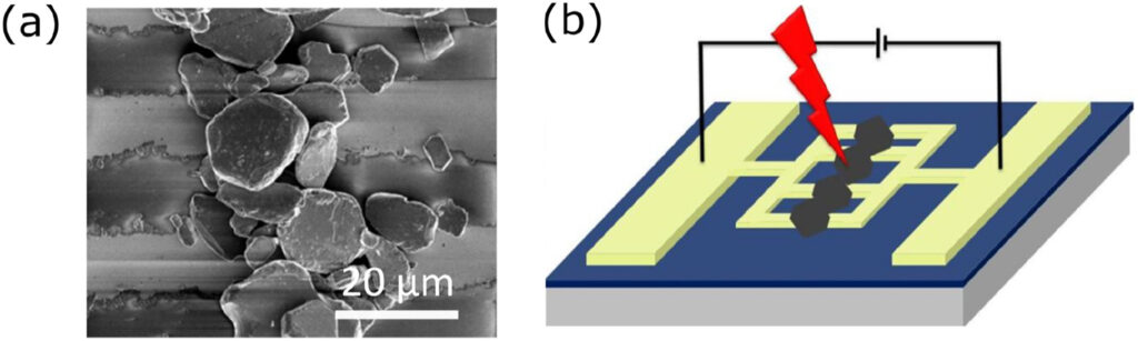 (а) изображение рабочей части фотодетектора, полученное с помощью сканирующего электронного микроскопа после выравнивания микрометровых нанослоев дисульфида титана между электродами. (b) принципиальная схема фотодетектора. Источник: Journal of Materials Research and Technology
