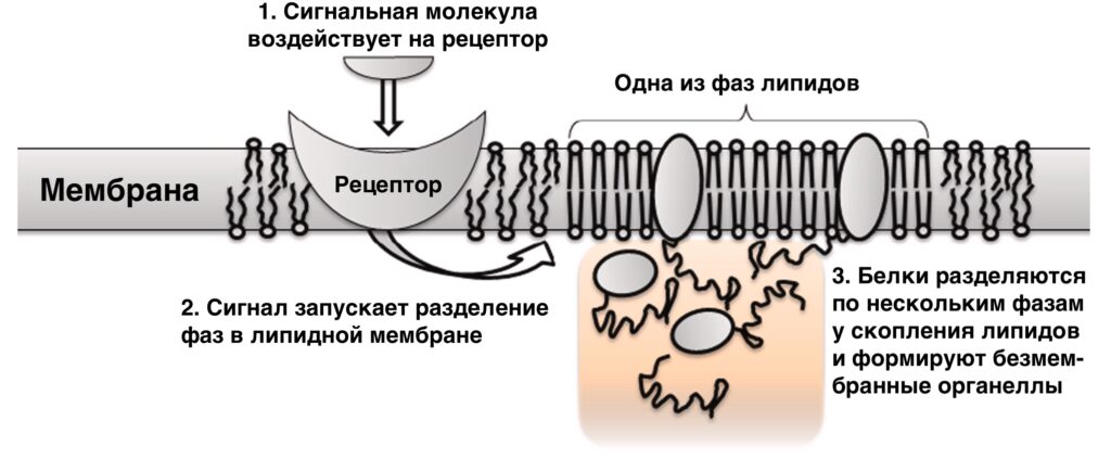 В работе ученые кратко описывают основные принципы разделения фаз в живых клетках. Авторы нашли взаимосвязь между разными процессами разделения фаз и предположили, что с помощью этого механизма клетка может получать сигналы об изменении внешних условий, практически не затрачивая энергии. Согласно разработанной учеными модели, перераспределение липидов в мембране вследствие разделения жидких фаз может запускать процессы фазового разделения белков, которые, в свою очередь, могут запускать или останавливать другие биохимические процессы в клетке (схема передачи сигнала изображена на Рисунке 2).