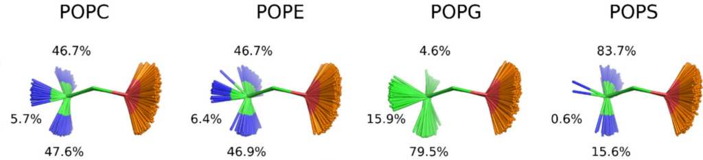 В новой работе авторы исследовали, какие структуры и на какую долю времени принимают разные распространенные в природе липиды (фосфатидилхолин и другие). Исследуемые липиды формировали разные мембраны — заряженные и незаряженные — и взаимодействовали с мембранными белками. Проведенное моделирование, основанное на прямом вычислении координат атомов в каждый момент времени, показало, что ни один из подходов не воспроизводит пространство состояний липидов точно (на рисунке 1 результаты моделирования). Однако параметры из Гарварда давали наиболее приближенные к реальным результаты. Из экспериментальных данных известно, что каждый из видов липидов может в разных состояниях связываться с широким набором белков. Однако стало известно, разные липиды имеют разные предпочтительные конформации, в которых их можно чаще наблюдать. Благодаря этому некоторые липиды могут легче связываться с конкретными белками.