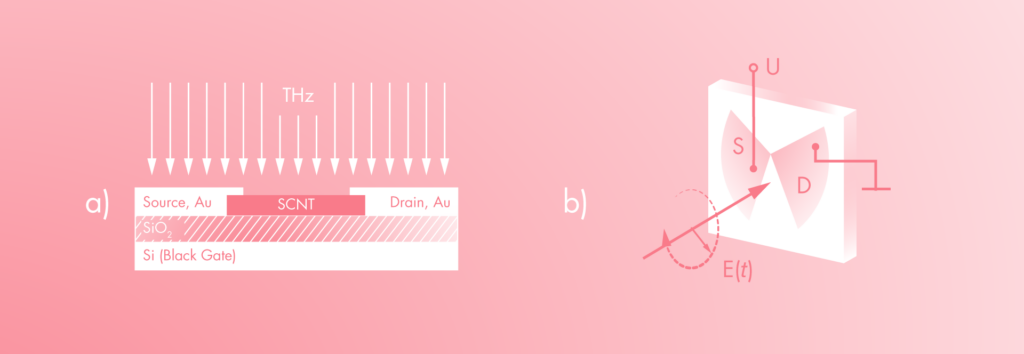 Ученые сделали образцы со следующей конфигурацией: отдельно лежащие углеродные нанотрубки присоединяли к металлической антенне специальной геометрии. Эта структура была положена на оксидированный кремний, и в результате получился полевой транзистор, каналом которого являются отдельные углеродные нанотрубки. Облучая такой образец терагерцовым лазером перпендикулярно поверхности кремния, можно получить сигнал постоянного фотонапряжения, возникающий между рукавами антенны. В формировании сигнала могут участвовать различные физические механизмы в зависимости от температуры, частоты и мощности излучения, структуры образца и других параметров. В рамках этой работы ученым удалось показать экспериментально и теоретически, что сигнал постоянного фотонапряжения, возникающий в описанном устройстве, несет в себе отпечаток интерференции двух плазменных волн, распространяющихся в углеродных нанотрубках навстречу друг другу. Наблюдение явления стало возможным благодаря особой геометрии антенны и использованию поляризованного по кругу лазерного излучения.