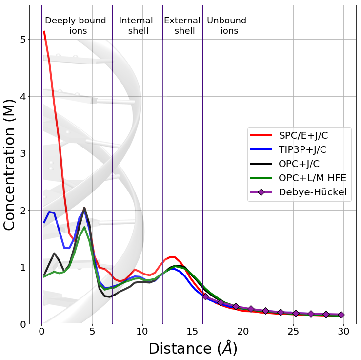 Вычисленные зависимости концентрации ионов от расстояния до оси ДНК в симуляциях с использованием разных моделей воды. Источник: Journal of Chemical Theory and Computation