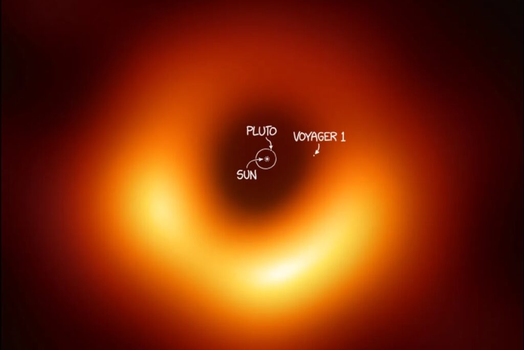 Изображение тени черной дыры в галактике М87 в сравнении с размерами орбиты Плутона вокруг Солнца и современным удалением от Солнца американского межзвездного зонда Войяджер-1 © Randall Munroe/XKCD