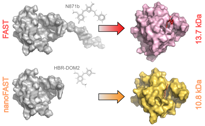 Структуры FAST и nanoFAST в комплексе с флуорогенами N871B и HBR-DOM2 и в свободном состоянии. Источник: пресс-служба ИБХ РАН