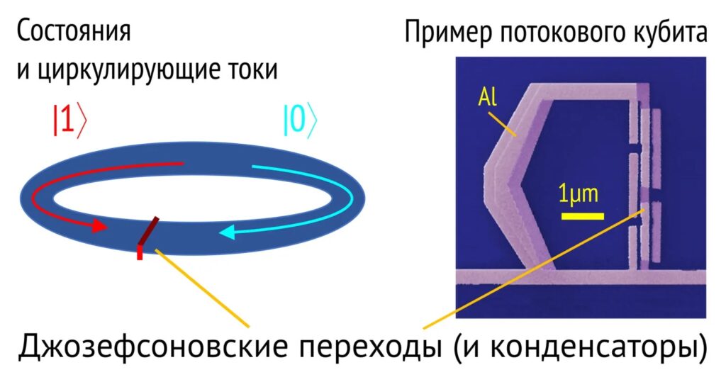 Принцип работы сверхпроводникового потокового кубита. На правой картинке приведено изображение реального потокового кубита (цвета добавлены). Синим цветом показана подложка из кремния. Фиолетовым цветом раскрашено кольцо из алюминиевой пленки с джозефсоновскими переходами
