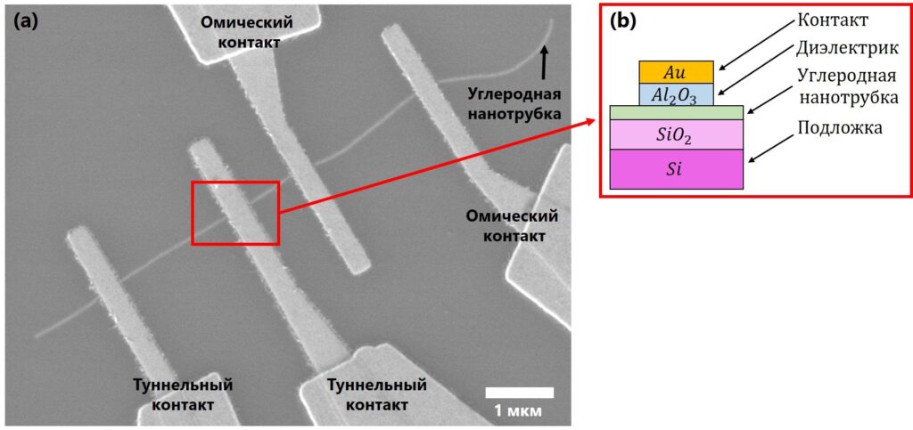 В опубликованной работе ученые предложили технологичный (то есть хорошо совместимый с современными технологиями изготовления электронных устройств) и масштабируемый метод для определения спектра электронов одиночной углеродной нанотрубки. Для этого исследователи изготовили туннельный контакт (см. рисунок (а)). Туннельный контакт — это контакт с очень высоким электрическим сопротивлением. Металл контакта не напрямую связан с трубкой, а через тонкий слой диэлектрика (см. рисунок (b)).