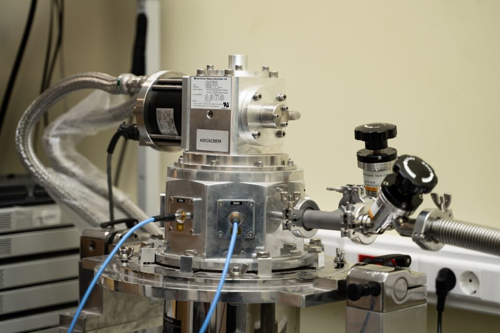 Криостат закрытого цикла используется для проведения низкотемпературных экспериментов по определению магнитных и магнитооптических свойств тонких пленок и гетероструктур. Синие кабели на фотографии используются для заведения сигналов на частотах до десятков гигагерц