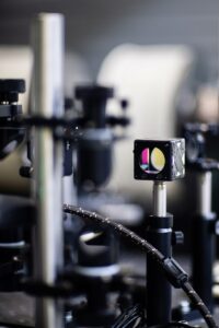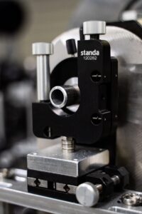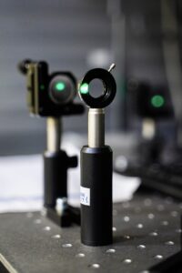 Генерация спиновых волн производится короткими лазерными импульсами. Важным является применение спектральных и нейтральных фильтров (изображенных на фотографии) для точной подстройки характеристик возбуждающего излучения