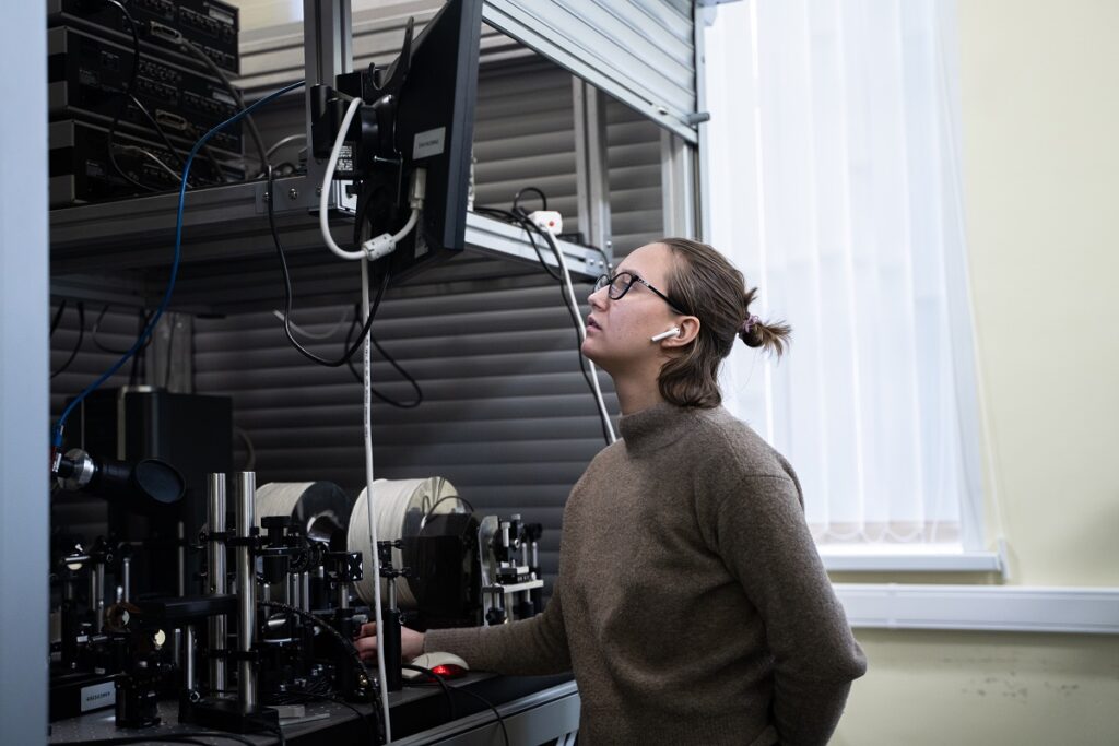 Александра Белькова, младший научный сотрудник группы Российского квантового центра, проводит эксперименты на установке «накачка — зондирование»