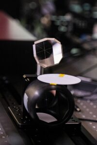 Два ретрорефлектора являются неотьемлемой частью установок «накачка — зондирование». Принцип работы ретрорефлектора заключается в том, что падающий на уголковый отражатель луч отражается строго в обратном направлении (по этой причине в самом отражателе виден объектив фотоаппарата). Каждый из отражателей на фото используется для совмещения во времени и задания желаемой величины временной задержки между лазерными импульсами накачки и зондирования. Два элемента используются для двух различных оптических схем и, соответственно, двух различных экспериментов.