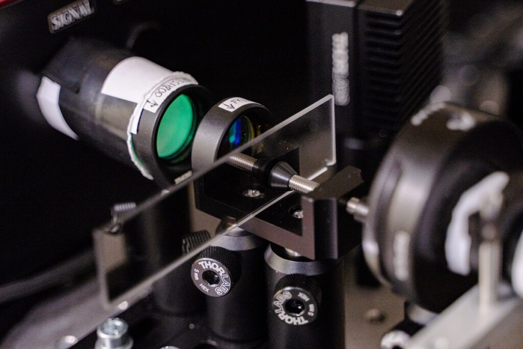 В зависимости от поставленной задачи и исследуемых объектов длина волны лазерного излучения может быть перестроена в видимом и ближнем ИК-диапазоне. На фотографии виден лазерный луч зеленого цвета (длина волны составляет 516 нм). Помимо этого, мощные лазерные импульсы ИК-диапазона используются для генерации ТГц-излучения