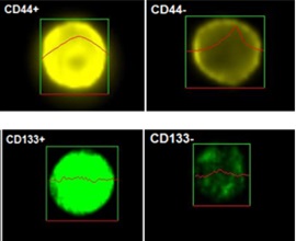 Рисунок. Раковые стволовые клетки (слева) несут на своей поверхности специфические маркеры (например CD44+ и CD133+), которые позволяют выделять их из общей популяции клеток. При окрашивании антителами, мечеными флуорохромами, эти клетки дают более яркое свечение по сравнению с теми клетками, которые таких маркеров не имеют. Источник: International Journal of Molecular Sciences