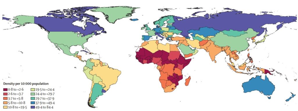 Мониторинг плотности и распределения медицинских работников имеет решающее значение для анализа и планирования систем здравоохранения как на национальном, так и на международном уровне. Одна из основных целей исследования — изучить взаимосвязи между наличием кадров и показателями охвата услугами здравоохранения.