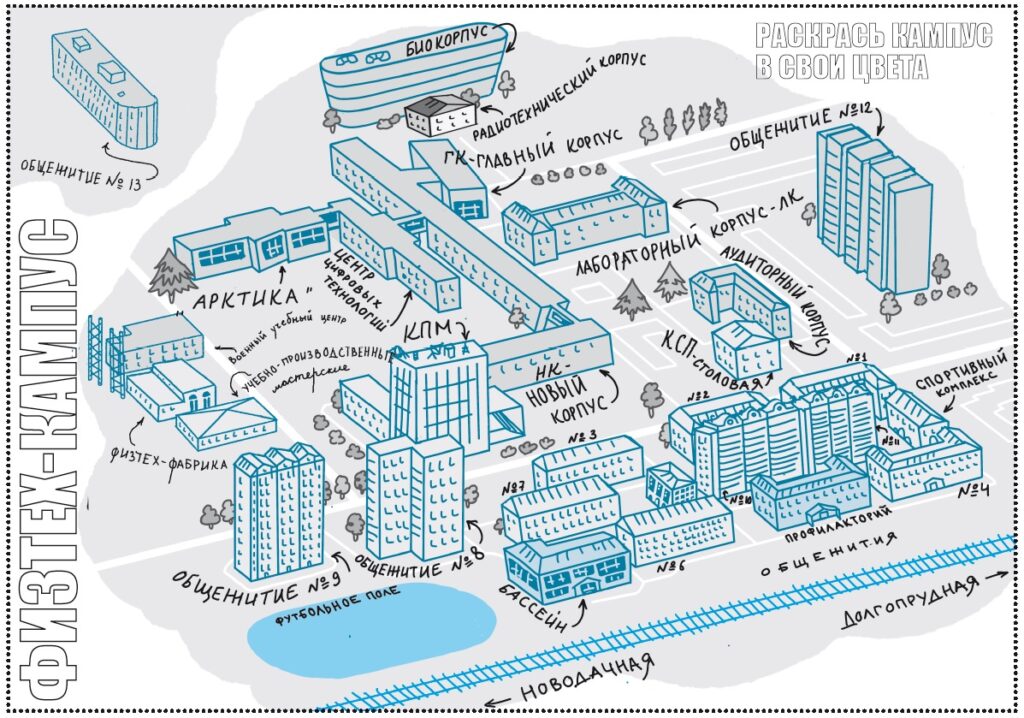 Карту кампуса и расположение общаг лучше выучить сразу — пригодится. Не верьте названиям корпусов. В них есть своя весьма неочевидная логика. Например, Аудиторный корпус называется так потому, что в нем нет ни одной учебной аудитории. Лабораторные работы проходят где угодно, но не в Лабораторном корпусе. А Арктика и Цифра куда новее Нового. Только с Биофармкластером все, казалось бы, хорошо. Но и тот называют аквариумом.