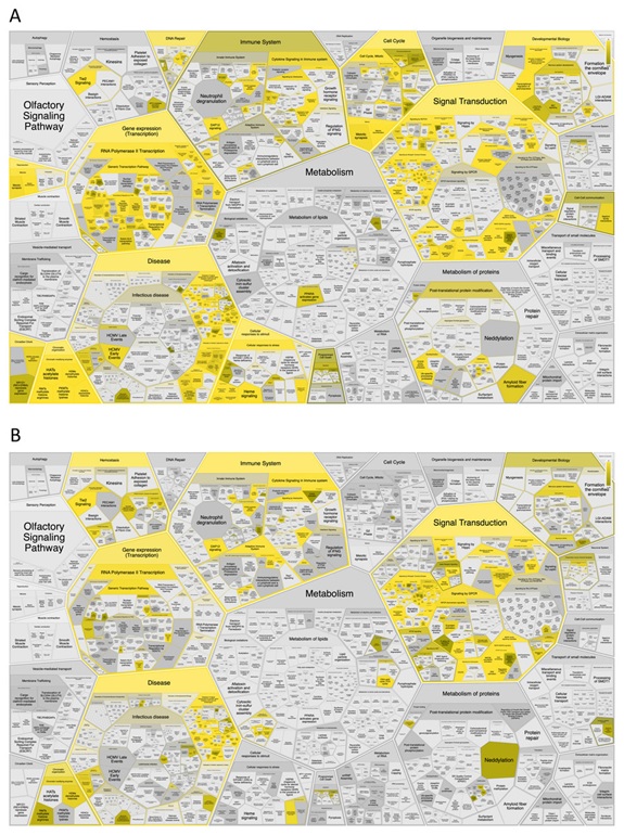 Статистически значимое представительство в функциональных категориях 50 наиболее сильных драйверных генов по версии Индекса силы драйвера (А) и Нормализованного индекса силы драйвера (В) — желтый цвет указывает на статистическую значимость. Источник: PeerJ Life & Environment
