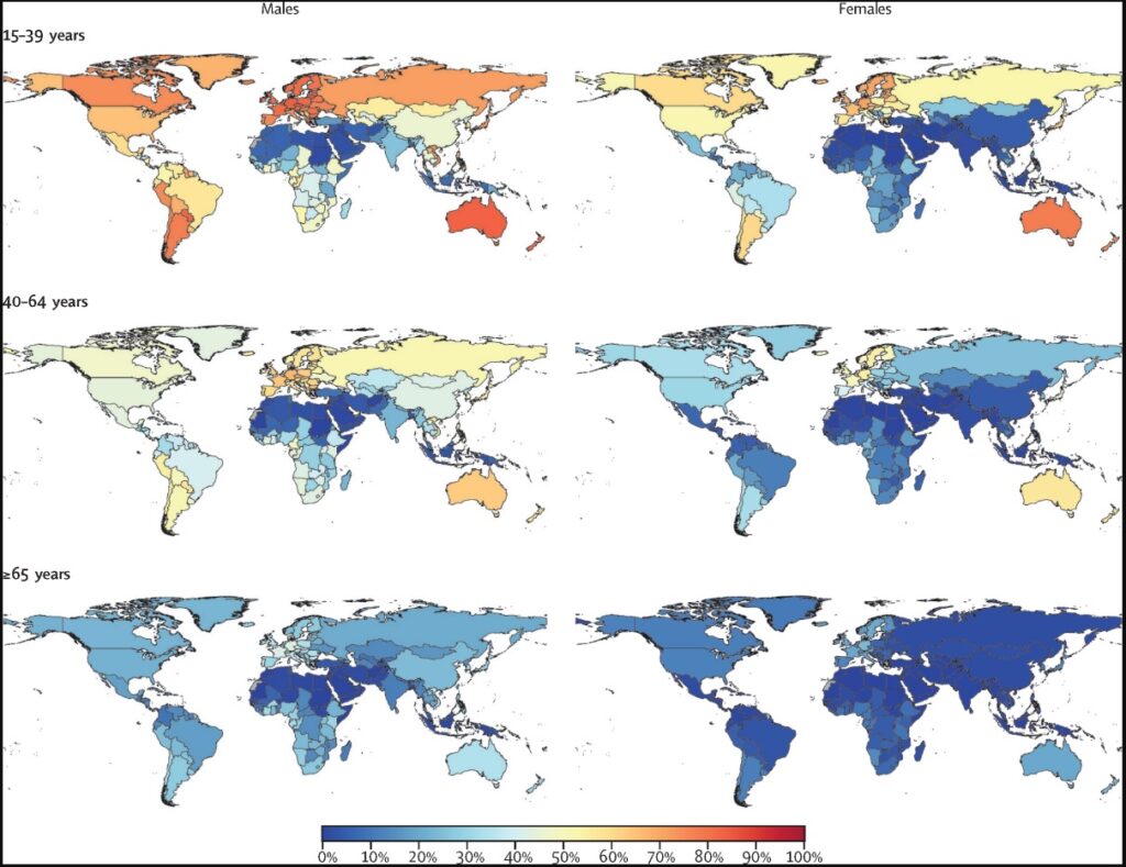 Согласно выводам ученых, злоупотребляют алкоголем в основном в возрастной группе от 15 до 39 лет, и большинство здесь составляют мужчины (75,5%). Регионы-лидеры — Австралазия (83,2 %), Западная Европа (79,3 %) и Центральная Европа (78,3 %). Среди женщин той же возрастной группы больше всего пьют в Австралазии (77,7%), Западной Европе (64,3%) и на юге Латинской Америки (59%). В период с 1990 по 2019 год в 14 странах наблюдался значительный рост вредного употребления алкоголя (Монголия, Сингапур, Боливия, Перу, Бразилия, Непал, Босния и Герцеговина, Польша, Камбоджа, Вьетнам и т. д.) в 55 странах — значительное снижение (США, Швейцария, Руанда, Джибути и т. д.). В 135 странах распространенность существенно не изменилась.
