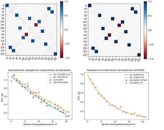 Вверху результаты томографии квантовых процессов (данные в двухкубитном представлении Паули). Процесс CZ, восстановленный по экспериментальным данным (слева), сравнивается с идеальным (справа). Внизу результаты перекрестного тестирования псевдослучайными последовательностями операций. Среднее значение точности выполнения одной двухкубитной вентильной операции CZ для всех пар кубитов составляет 97,38%.