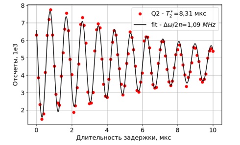 Зависимость когерентности кубита от времени измерения. Время когерентности, вычисленное путем аппроксимации данных, составляет 8,31 мкс