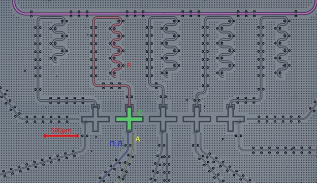 Фотография КИМС с оптического микроскопа (в ложном цвете). Микросхема реализует пять кубитов (емкость одного из них отмечена зеленым), связанных с резонаторами (красный), для индивидуального считывания. Каждый кубит снабжен управляющей потоковой линией и антенной для осуществления однокубитных операций (синий и желтый соответственно)