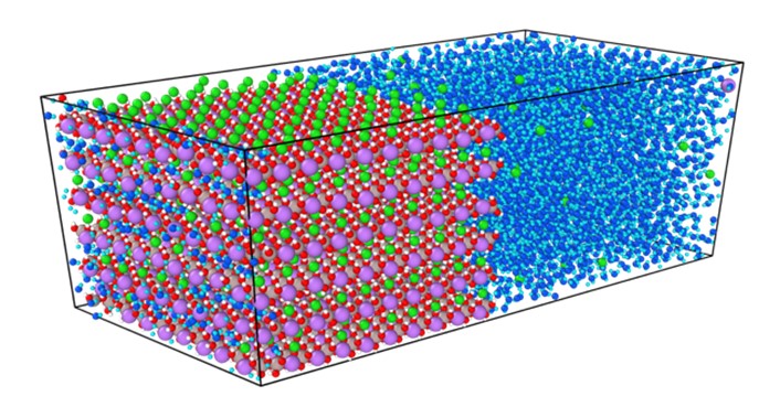 Модель, позволяющая описывать на атомистическом уровне сорбцию лития на слоистом гидроксиде алюминия из водного раствора. Иллюстрация предоставлена сотрудником лаборатории Вячеславом Лукьянчуком