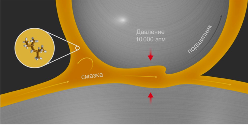 Схема подшипника со смазочной жидкостью, свойства которой могут сильно изменяться при высоких давлениях
