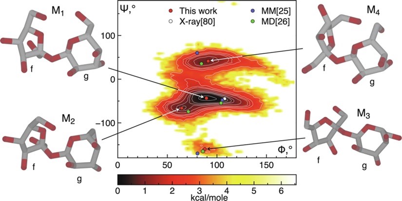 Конформации молекулы сахарозы в водном растворе, рассчитанные в недавней работе, один из авторов которой — Владимир Дещеня, студент первого курса магистратуры МФТИ