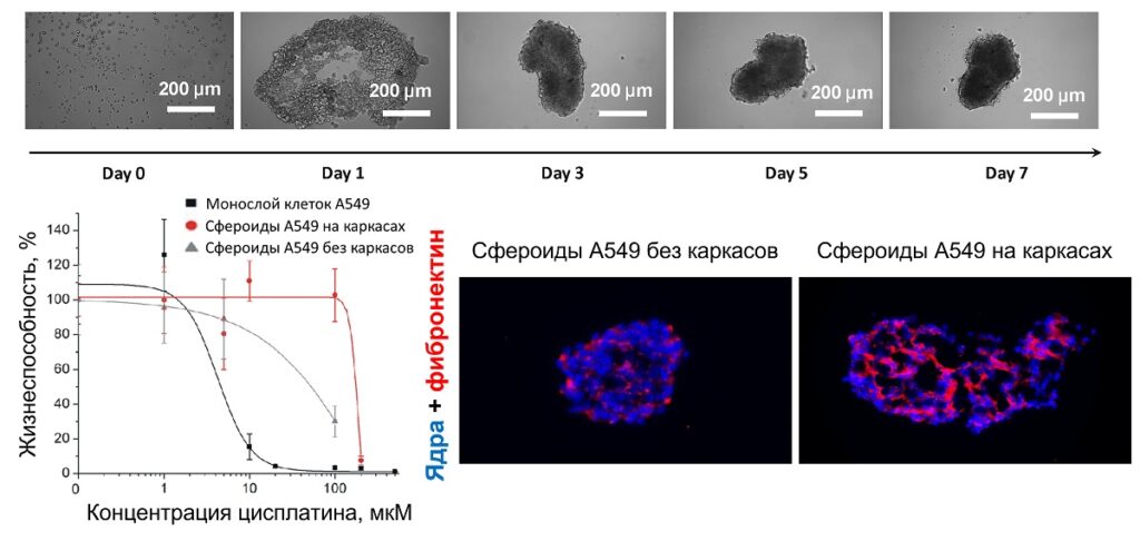 Формирование раковых сфероидов на биополимерных каркасах, профили их лекарственной устойчивости к цисплатину и изображения их срезов в сравнении со сфероидами, полученными без использования биополимерных каркасов. Источник: International Journal of Molecular Sciences