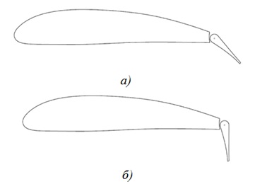 Рисунок 1 Общий вид профиля крыла с отклоненным элероном: а – ™эл. = 30° (взлет), б – ™эл. = 70° (посадка)