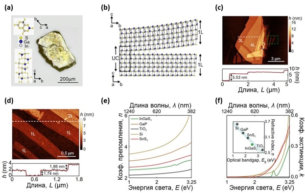(a) Оптическая фотография кристалла InGaS3; (b) предполагаемое направление разрыва связей; (c-d) фотографии атомно-силовой микроскопии полученных двумерных объектов; (e) показатель преломления в сравнении с типовыми материалами с (e) высоким показателем преломления и (f) узким диапазоном поглощения. Вставка отражает оптическую запрещенную зону и соответствующий показатель преломления