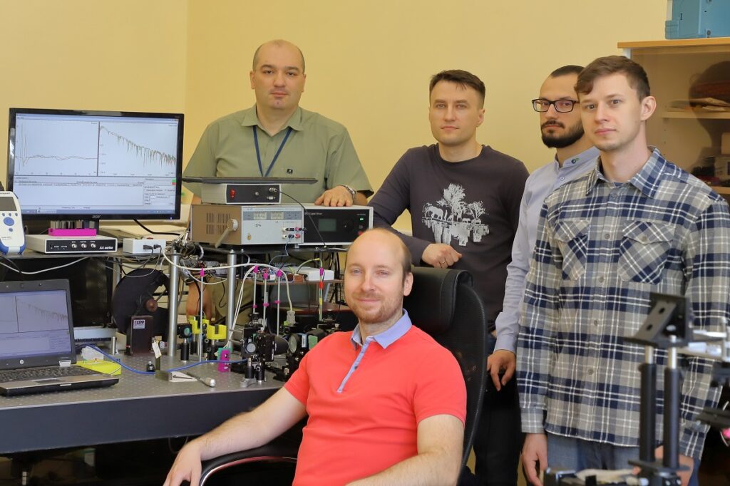 Группа разработчиков рядом с лабораторным спектрометром, в котором в качестве источника терагерцовых импульсов используется разработанный плазмонный излучатель. Слева направо Денис Лаврухин, Дмитрий Пономарёв, Александр Ячменев, Никита Черномырдин и Игорь Глинский. Фото предоставлено Дмитрием Пономарёвым.