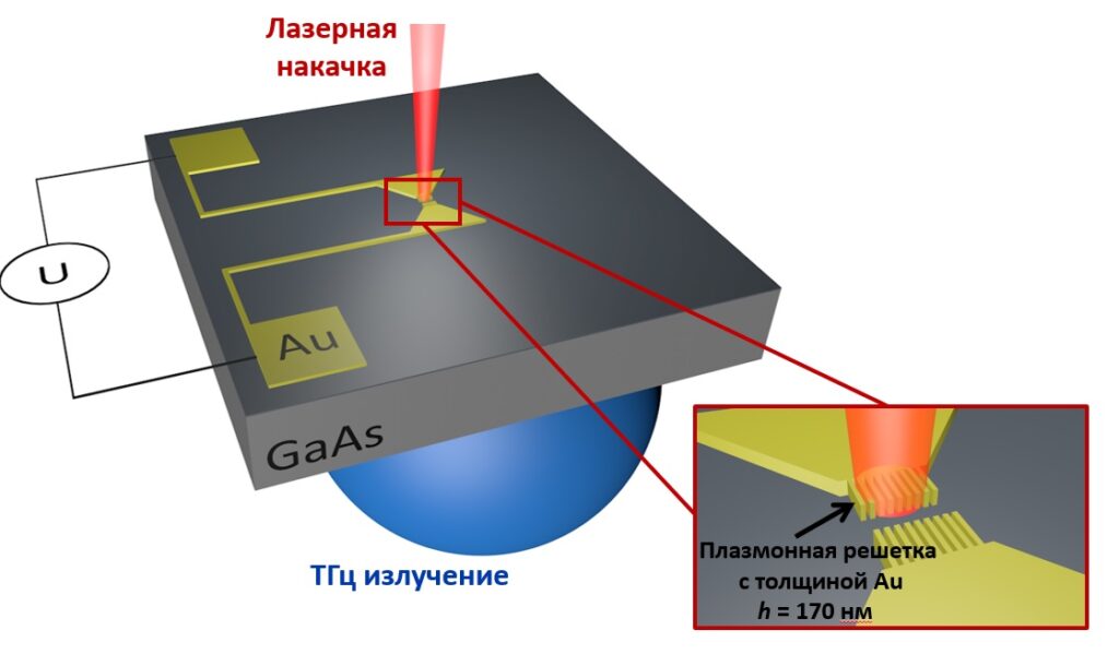 Коллектив ученых из МФТИ, Института сверхвысокочастотной полупроводниковой электроники им. В. Г. Мокерова РАН (ИСВЧПЭ РАН), МГТУ им. Н. Э. Баумана и Института общей физики им. А. М. Прохорова РАН разрабатывает оптоэлектронную составляющую для отечественного спектрометра с уникальными характеристиками. Сам прибор состоит из излучателя, который воздействует на исследуемый объект импульсом излучения определенной частоты, и приемника, который регистрирует получаемый в результате спектр. Есть традиционные подходы к созданию фотопроводящих терагерцовых излучателей. Принцип работы у них следующий: излучатель очень короткими фемтосекундными импульсами возбуждает электроны в полупроводнике, в результате возникает ток, электроны текут к одному контакту, дырки — к другому. Этот ток является генератором терагерцового излучения.
