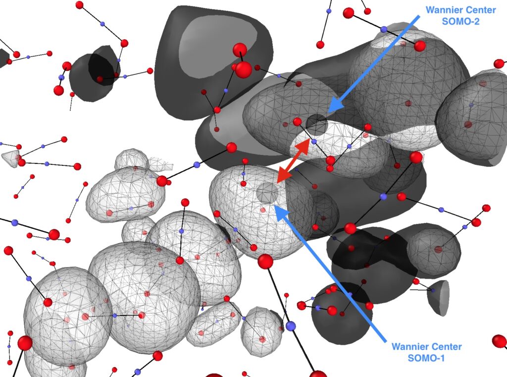Поверхности электронной плотности однократно заполненных верхних электронных орбиталей, образующих экситон, и центры Ваннье этих орбиталей (из статьи в журнале Письма в ЖЭТФ)