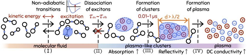 «Вначале мы имеем флюид молекулярного водорода, в котором по мере нагрева все чаще и чаще электроны спонтанно возбуждаются в результате вибронного переноса энергии от ядер к электронам (то есть возникают экситоны — электрон-дырочная пары), но затем эти возбуждения переходят обратно в основное состояние (I), потом в определенный момент экситон успевает диссоциировать до момента обратной рекомбинации (II) и уже не может перейти обратно. Этот процесс отнимает кинетическую энергию у протонов (в экспериментах при этом наблюдается плато температуры при постепенном увеличении энерговклада, красные точки на фазовой диаграмме). Таким образом, у нас появляется “зародыш плазмы” в виде связанного кластера двух электронов и двух протонов, поскольку таких процессов в флюиде водорода в экспериментальных условиях происходит множество, то начинает расти плазмоподобная фаза в виде отдельных изолированных кластеров, которые сначала начинают поглощать свет (зеленые точки на фазовой диаграмме), а затем (III), когда размеры кластеров становятся соизмеримы с длиной волны пробного лазерного импульса, начинают отражать (синие точки на фазовой диаграмме). В итоге весь флюид переходит в плазму (IV), когда в экспериментах наблюдают рост электрической проводимости (фиолетовые точки на фазовой диаграмме)», — объясняет Илья Федоров.