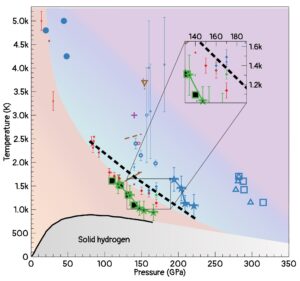 Отметим, что отличия между металлической жидкостью и плазмой достаточно условны: плазма — это более горячее состояние, жидкий металл — более холодное, и в обоих состояниях есть свободные электроны, которые проводят электрический ток. Еще в 30-х годах XX века великий физик-теоретик Юджин Вигнер предсказал, что при низких температурах в водороде присутствует область, в которой он становится твердым и превращается в металл, и сейчас эту фазу с большим интересом изучают во всем мире. Таким образом, ученые продвинулись в нескольких направлениях, но ни в одном не пришли пока к однозначному результату.