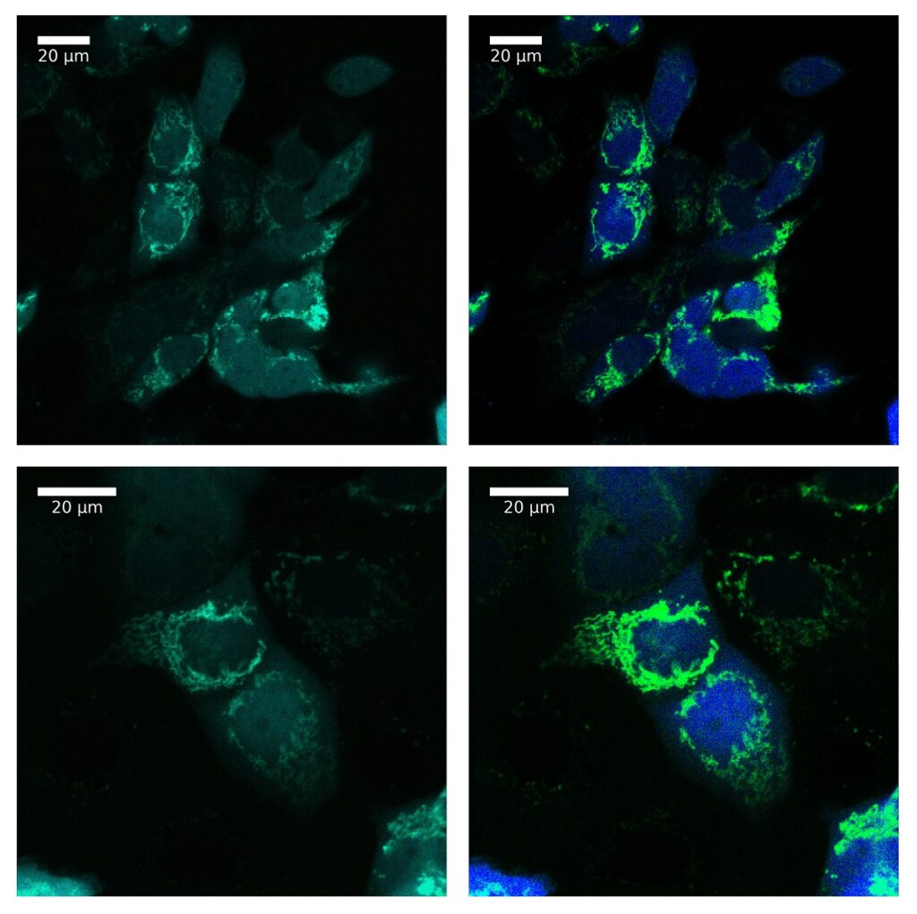 Изображение клеток под микроскопом. Слева исходные изображения, справа — обработанные. Использование флуоресцентных белков позволяет одновременно увидеть расположение митохондрий (зеленый) на фоне цитоплазмы клеток (синий). Источник: Journal of Biological Chemistry