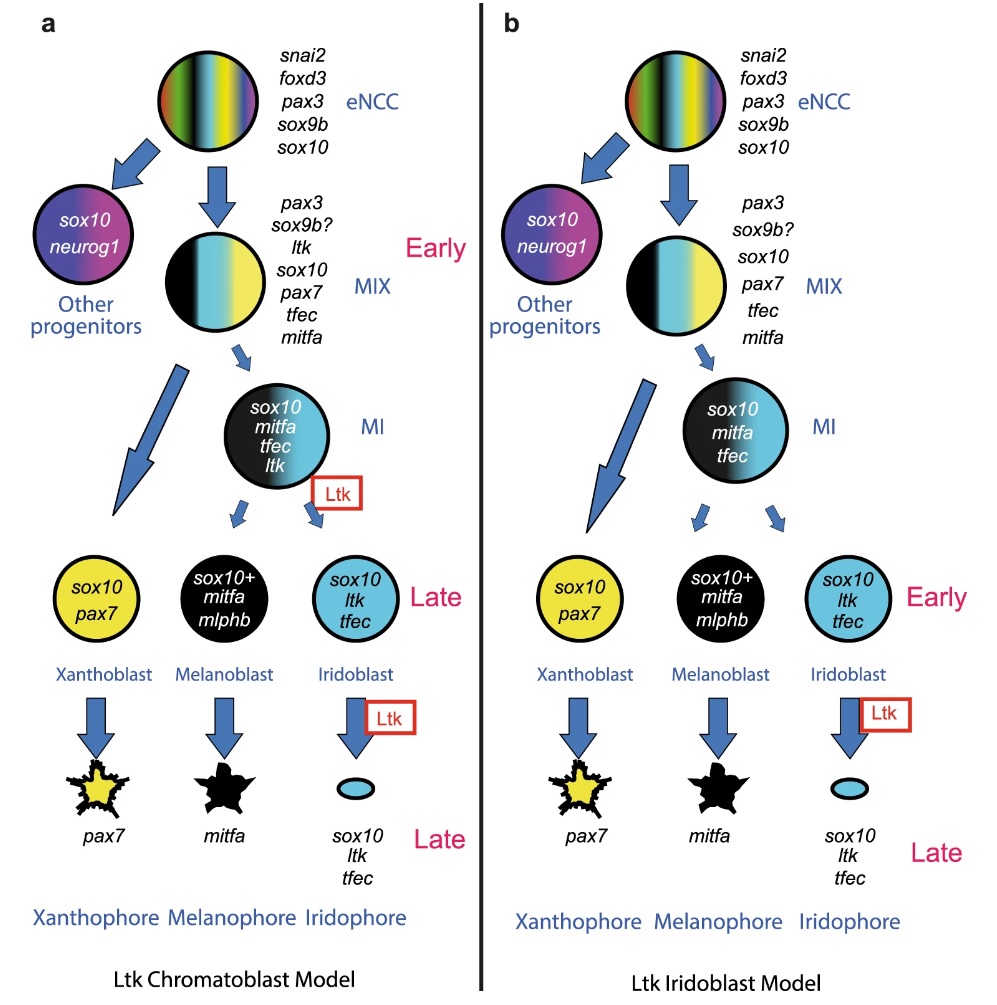 Клетки нервного гребня со своими потомками (их называют также «производными») — довольно сложная система, представляющая собой сообщество разных типов клеток. Главное, что затрудняет исследования: эти клетки не образуют пластов из-за постоянной миграции, и их довольно трудно выделить на пути перехода. Таким образом, объектом исследования стали пигментные клетки, которые имеют присущий им цвет, что наглядно видно у ярких рыбок Danio rerio. Давняя, но непроверенная гипотеза предполагает, что все типы пигментных клеток у позвоночных имеют общего и эксклюзивного предшественника.
