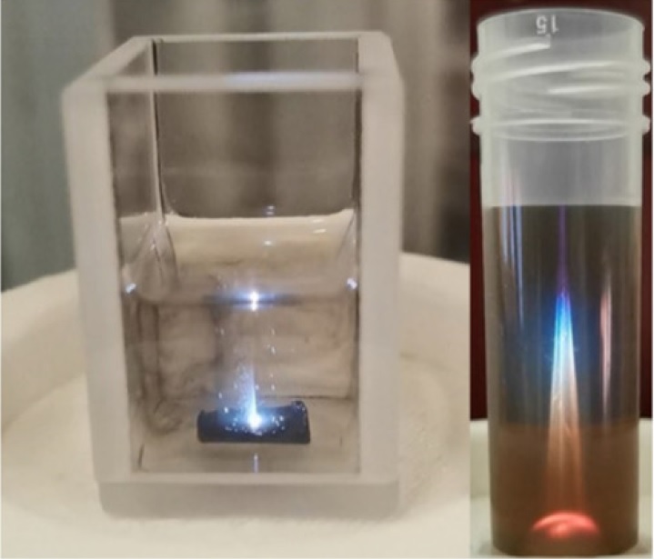 Фотография процесса лазерной абляции (слева) и лазерной фрагментации (справа) дисульфида молибдена. Источник: Journal of Materials Chemistry C