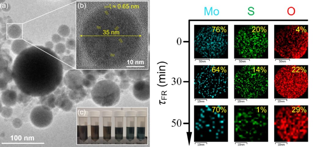 Слева изображены наночастицы дисульфида молибдена в спиртовом растворе, на верхней вставке видны оболочка и ядро частицы, на нижней — цвет раствора с частицами после 10, 20, 30, 40, 50 и 60 минут дефрагментации соответственно. Справа показан процесс превращения дисульфида молибдена в субоксид молибдена MoO3-x с ростом времени дефрагментации (визуализация получена методом энергодисперсионной рентгеновской спектроскопии). Источник: Journal of Materials Chemistry C