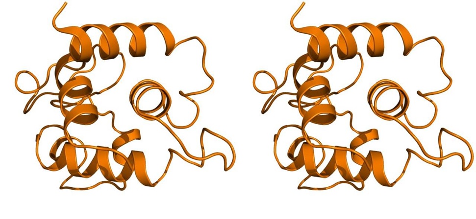 Схематическое изображение пространственной структуры дестабилазы. Правая и левая картинки являются параллельными стереопарами — они практически одинаковы, но изображены с небольшим смещением относительно друг друга. Если расфокусировать взгляд и смотреть как бы «сквозь» картинку, в глубине кадра возникает объемное изображение.