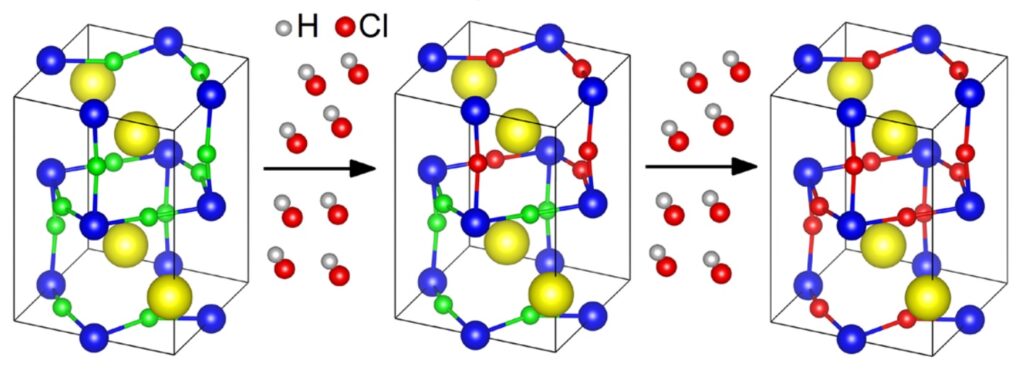 Затем исследователи решили изменить химический состав перовскита CsPbBr3. Для этого кристалл помещали в газовую атмосферу соляной кислоты HCl, где происходило постепенное замещение атомов брома на хлор. Так же плавно уменьшался показатель преломления. А значит, регулируя время химической реакции, ученые могли регулировать оптические свойства материала.