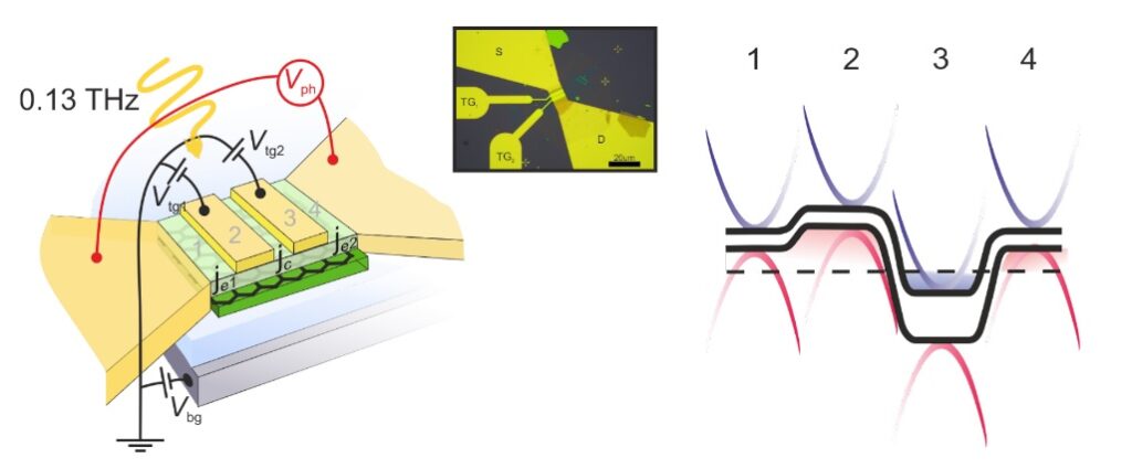 Графен давно вступил в «гонку за терагерцы» в качестве активного элемента для терагерцового детектирования и показывает хорошие результаты. Двухслойный графен, в отличие от бесщелевого однослойного, обладает уникальным свойством переменной запрещенной зоны в зависимости от величины поперечного электрического поля. При отсутствии внешнего поля двухслойный графен является бесщелевым полуметаллом (как и однослойный при любых полях), однако приложение поперечных электрических полей с двух затворов — сверху и снизу относительно листа графена — позволяет открывать запрещенную зону и менять концентрацию носителей в энергетических зонах, переводя графен в полупроводниковое состояние.
