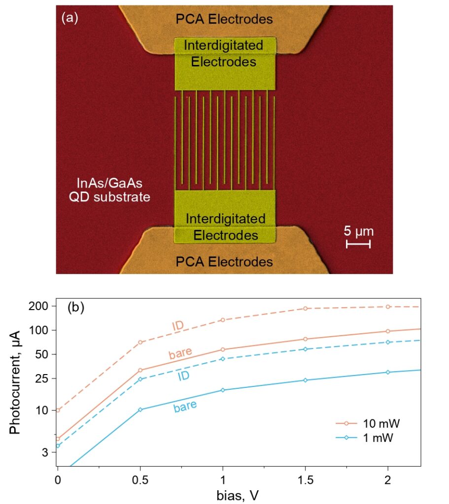 Чтобы для генерации терагерцового излучения было достаточно лазерных импульсов малой мощности, ученые улучшили фотопроводящую антенну, присоединив к ее контактам симметричные золотые встречно-штыревые электроды, по форме напоминающие расческу с очень тонкими и часто расположенными (на расстоянии порядка нескольких сотен нанометров) элементами, называемыми пальцами. Такая форма электродов позволяет значительно увеличить запасенную в излучателе энергию за счет увеличения его емкости. Кроме того, авторы разместили антенну на подложке из соединений индия и галлия с мышьяком (InAs/GaAs), которые выполняли роль квантовых точек — структур, участвующих в переносе электрического заряда на встречно-штыревые электроды.