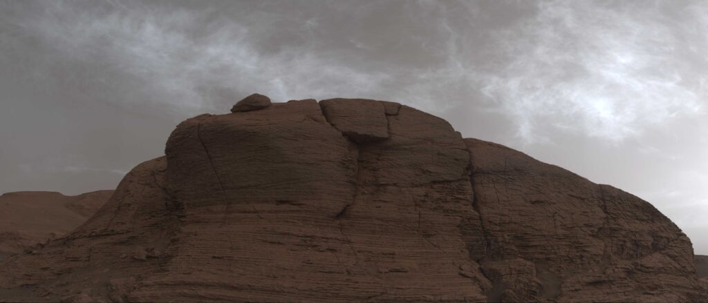 Фотография марсианских облаков, снятых в марте 2021 года аппаратом Mars Science Laboratory Curiosity. Облака расположены на высотах свыше 60 км и состоят, судя по всему, из частиц сухого льда